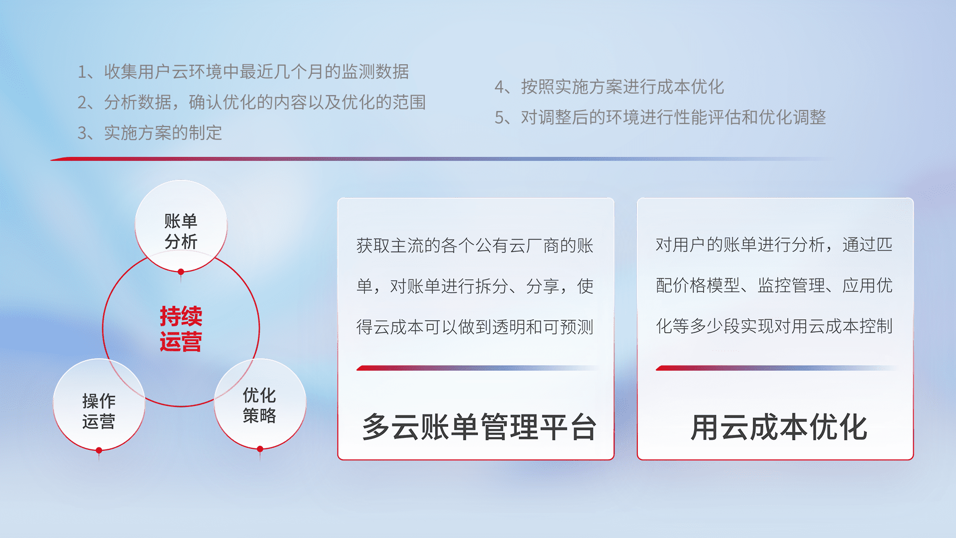 通过多云纳管,,,以统一的资源数据模型把客户的云资源进行抽象和封装,,,,进而实现对多云资源的统一操作,,保障云资源管理的可靠性、、稳定性与可用性。。。。量身定制化运维内容,,,,配置、、、开发运维、、、、补丁管理、、、备份、、、监控、、、认证和访问管理、、审计和日常巡检等,,,,保障在用云过程中的可靠度,,,稳定度以及高可用率。。